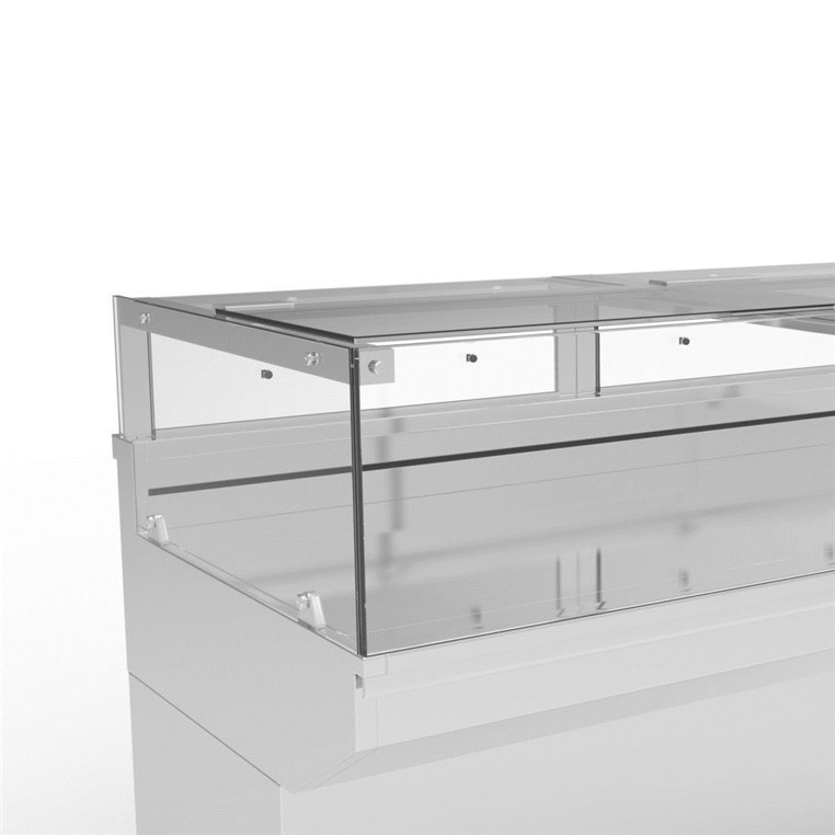 - T2:Vertical front glass with welded top opening system downwards power-assisted with double shock absorbers.Glass intermediate shelf.LED lighting canopy in brilliant aluminum and in every display area,plexiglas sliding doors.