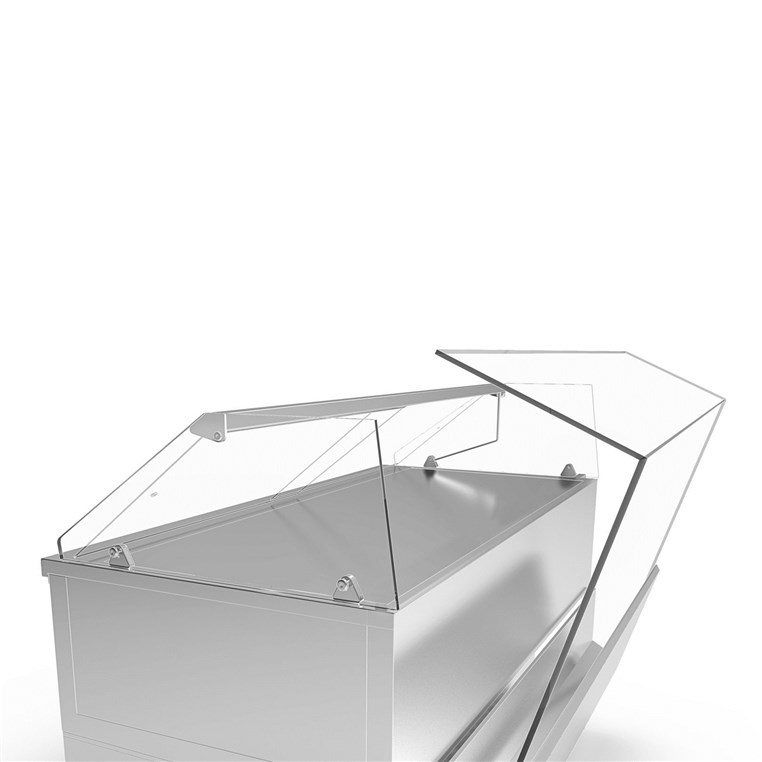 - T1:Inclined front glass with welded top opening system dowmwards power assisted with double shock absorbers.Glass intermediate shelf.LED lighting canopy in brilliant aluminum and in every display area,plexiglas sliding doors.