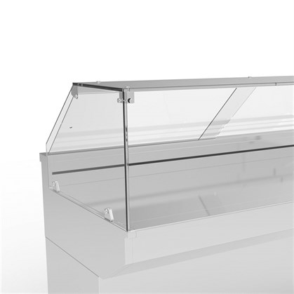 - T2:Vertical front glass with welded top opening system downwards power-assisted with double shock absorbers.Glass intermediate shelf.LED lighting canopy in brilliant aluminum and in every display area,plexiglas sliding doors.
